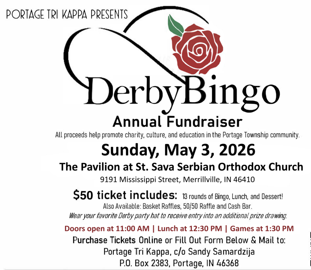 The event theme again this year is “Derby Bingo” and will take place Sunday, May 3, 2026 at The Pavilion at St. Sava Serbian Orthodox Church, 9191 Mississippi Street, Merrillville, IN.